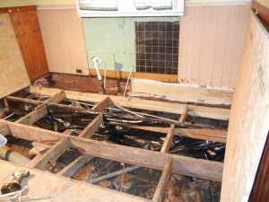Cabinets removed, joists repaired.